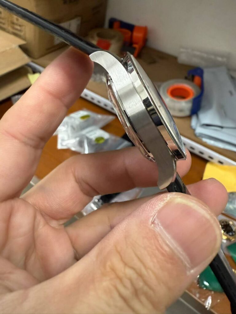 - ストラップの質感: 付属のブラックレザーストラップはカーフスキンにワニ革の型押しをしたものです。純正のアリゲーター革に比べると光沢が強く、少し不自然なテカリがあります。