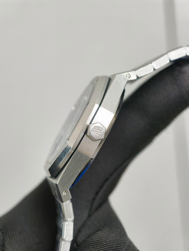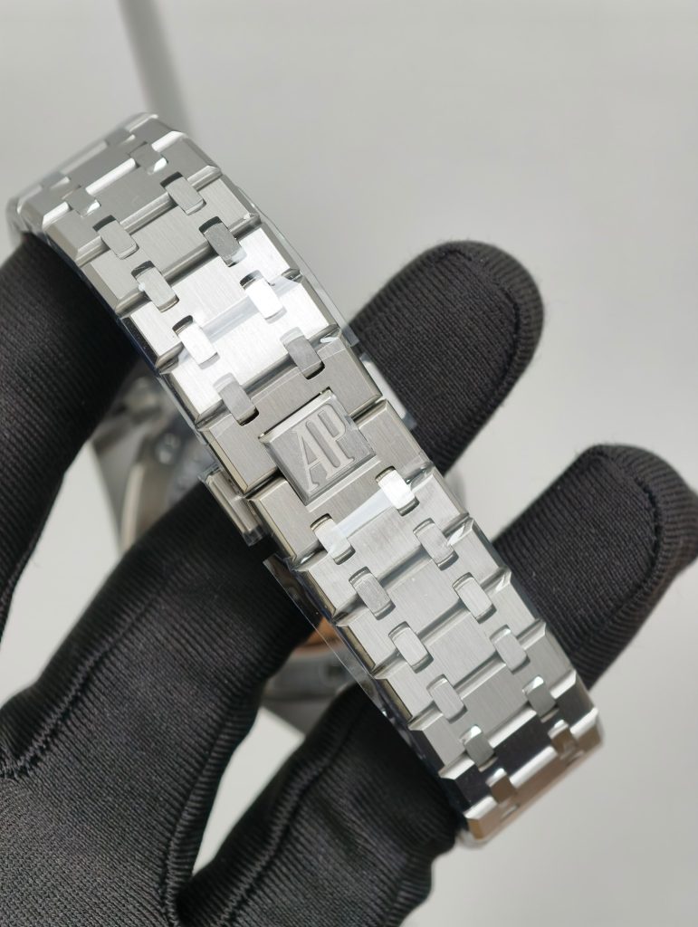 • サテンとポリッシュの融合: ヘアライン加工された面と、鏡面仕上げされた面取り部分の境界線が非常にシャープです。光を受けるとキラキラと輝く「ロイヤルオーク・マジック」を見事に再現しています。