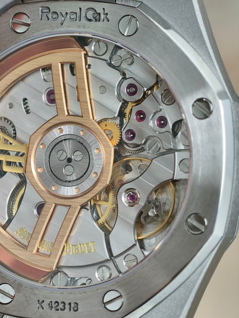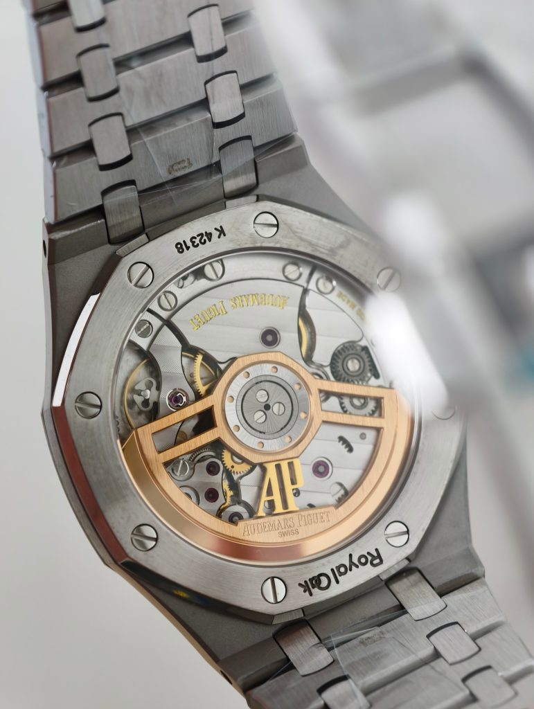 2. 純正同様のゴールド刻印: 自動巻きローターやブリッジの刻印は、プリントではなく深く掘り込まれたゴールド仕上げです。裏蓋から見える景色は、まさにオーデマピゲ N級品の証です。