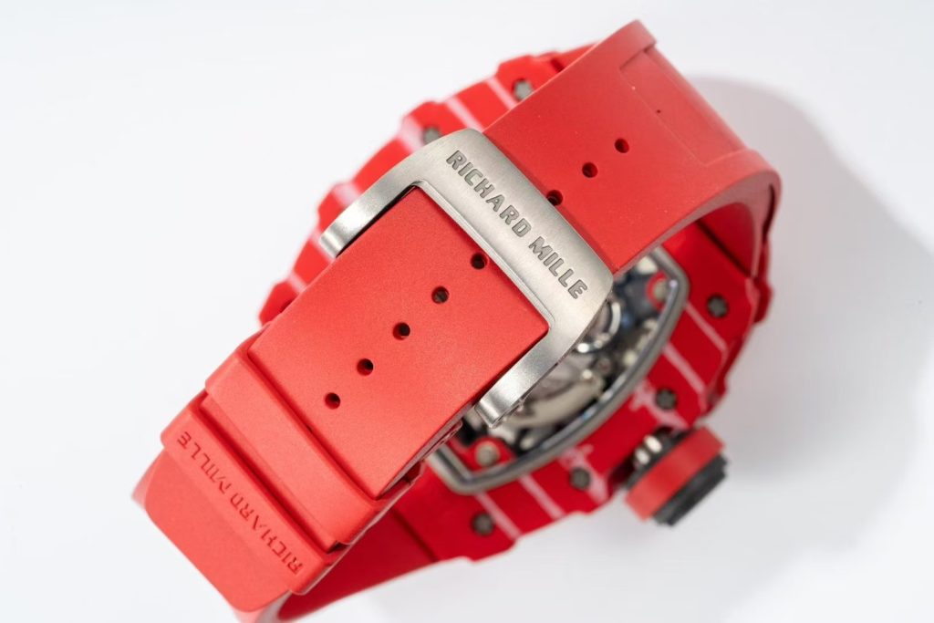 ストラップには天然フッ素ゴム素材を使用し、一体成型で瑕疵ゼロになります。画像で確認できる柔軟さとフィット感は、手首に優しく馴染み、長期着用でもストレスフリーです。また、バックルは市場最高峰のクオリティで、全てチタン製です。APS工場のこのこだわりが、リシャール・ミル rm35-02 スーパークローンを日常の相棒に変えてくれます。