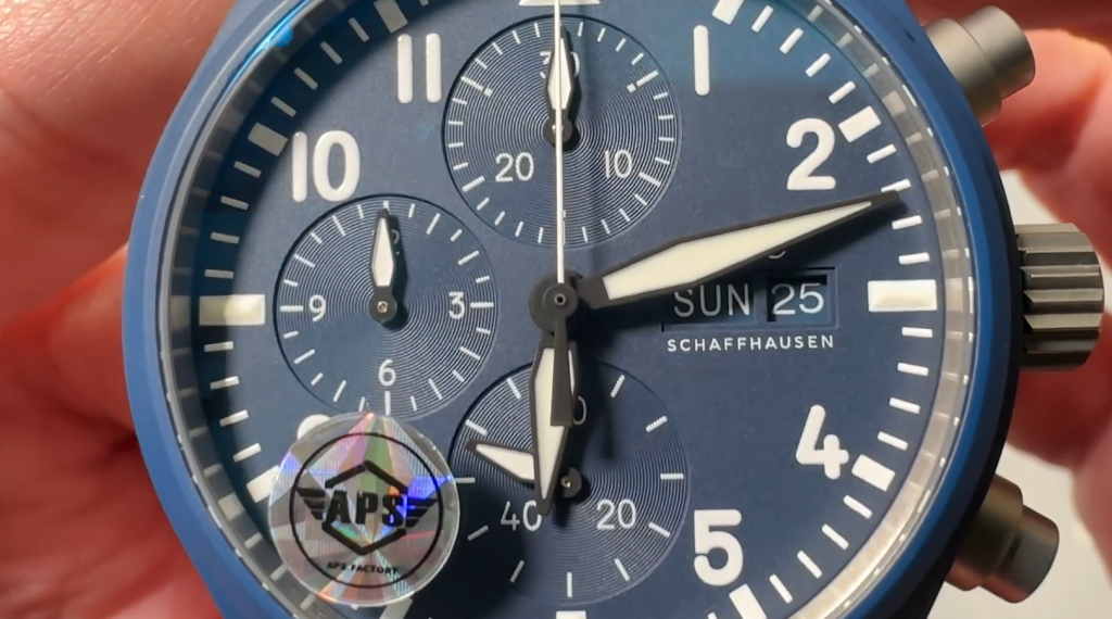 A2: 搭載されている「スーパークローン 69385」は、APS工場が過去のIWC パイロットウォッチ スーパークローンで実績を積んできた自社製クローンムーブメントであり、クロノグラフの動作も含め非常に高く評価されています。