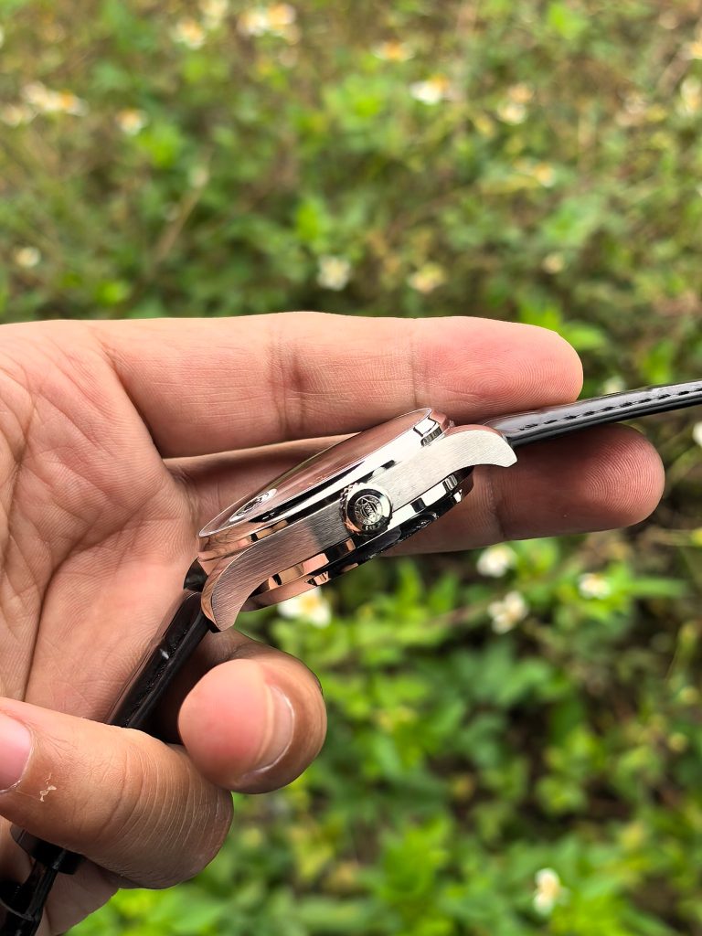 - 絶妙なサイズ感: ケースサイズは42.3mm、厚さ14.1mmに設定されており、手首にしっかりとした存在感を与えつつも、ビジネススーツの袖口に美しく収まる適度な厚みを維持しています。