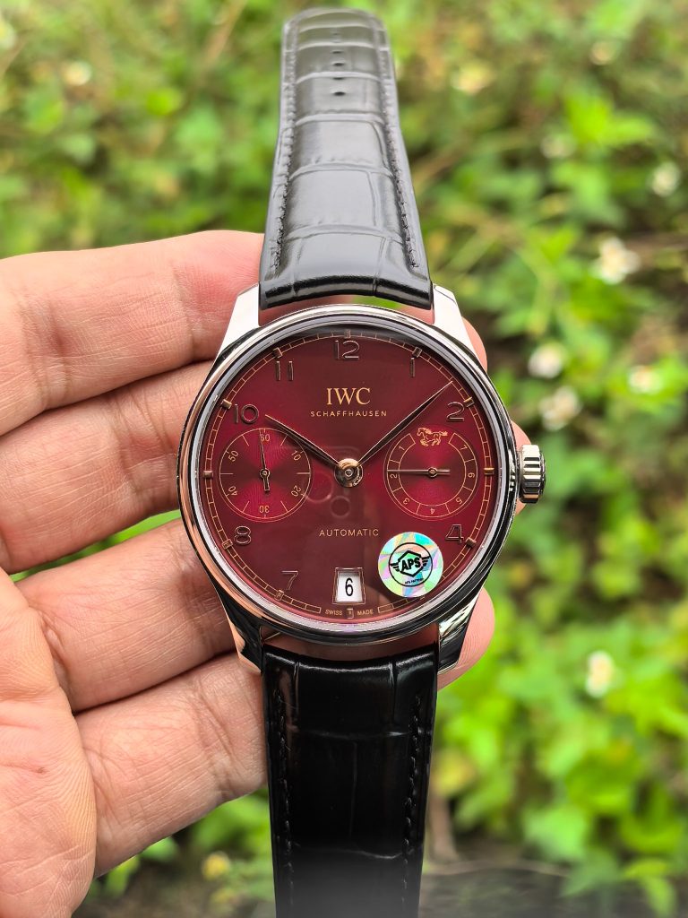 ポルトギーゼ・コレクションの真骨頂である、エレガントで均整の取れた文字盤デザインはそのままに、この特別モデルは息を呑むほど美しい深紅のダイヤルを採用しています。