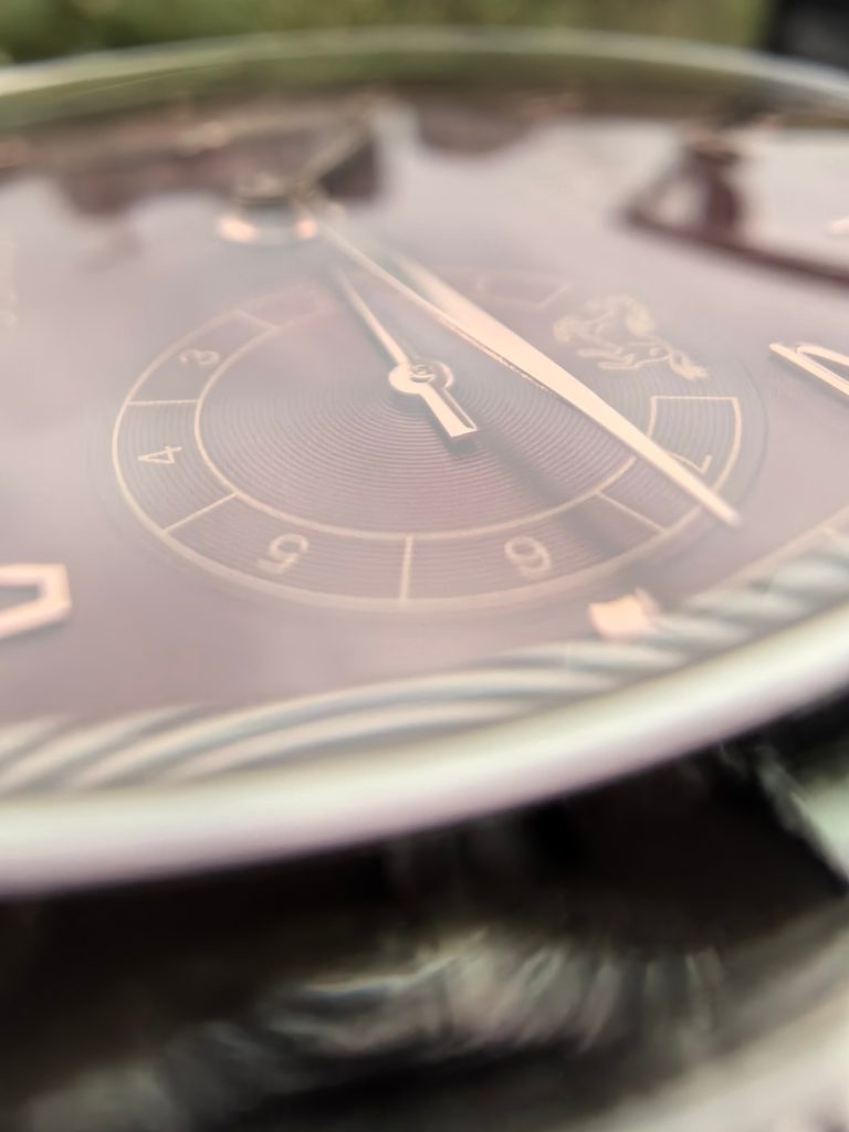 - 馬のモチーフ: 3時位置のパワーリザーブ計の中には、ひっそりと、しかし力強く躍動する「黄金の馬」のアイコンがあしらわれており、特別感を一層引き立てています。