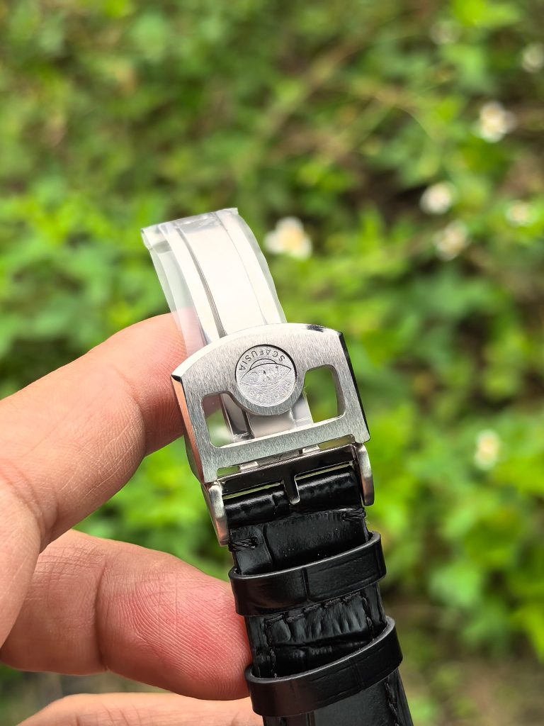 ストラップには、肌触りが良く高級感あふれるブラックの「イタリアンカーフレザー」を採用しています。これにIWC純正クラスの高品質なフォールディングバックルが組み合わされており、着脱のしやすさと耐久性を兼ね備えています。