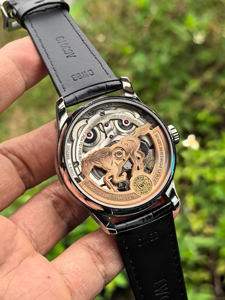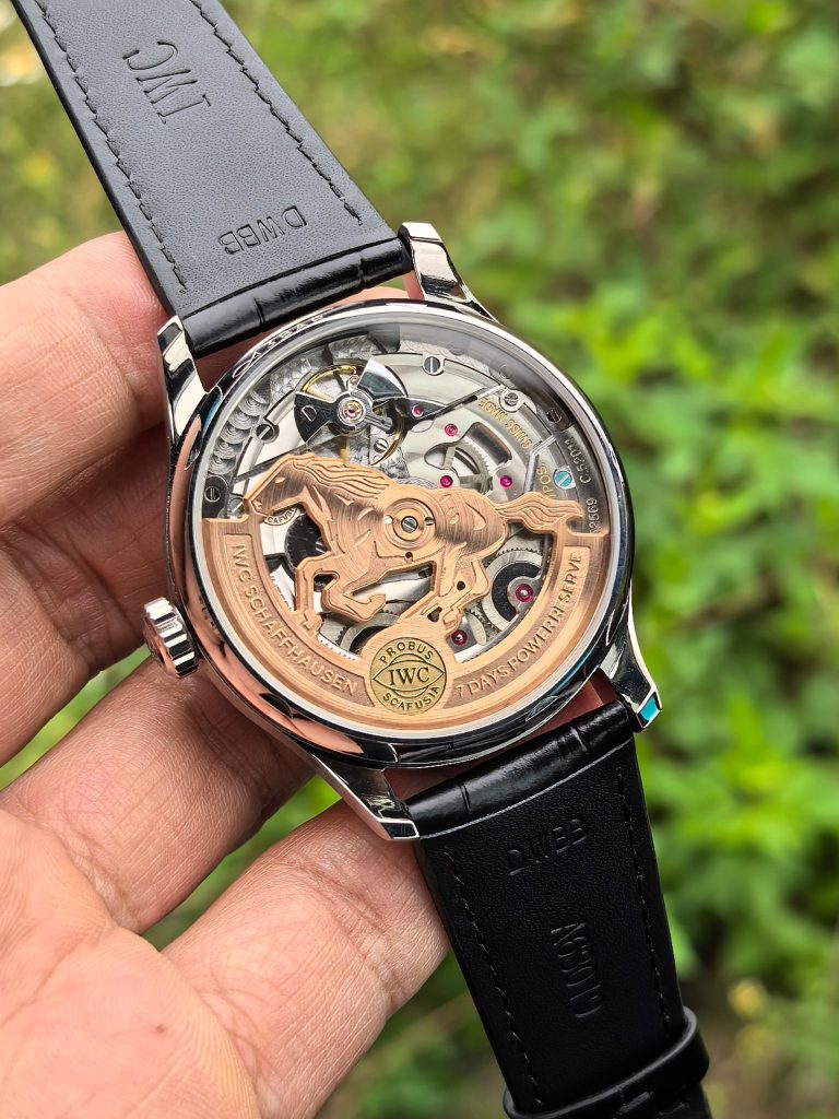 - 特製の「馬」ローター: 自動巻きローターが、なんと丸ごと「黄金の跳ね馬」の彫金デザインに変更されています。このローターが腕の動きに合わせて360度回転する様は、「時が来れば運が向く」という素晴らしい寓意を持っています。コストを度外視して作り込まれたこの緻密な彫刻は、まさに真のIWC ポルトギーゼ N級品のみが到達できる芸術領域です。